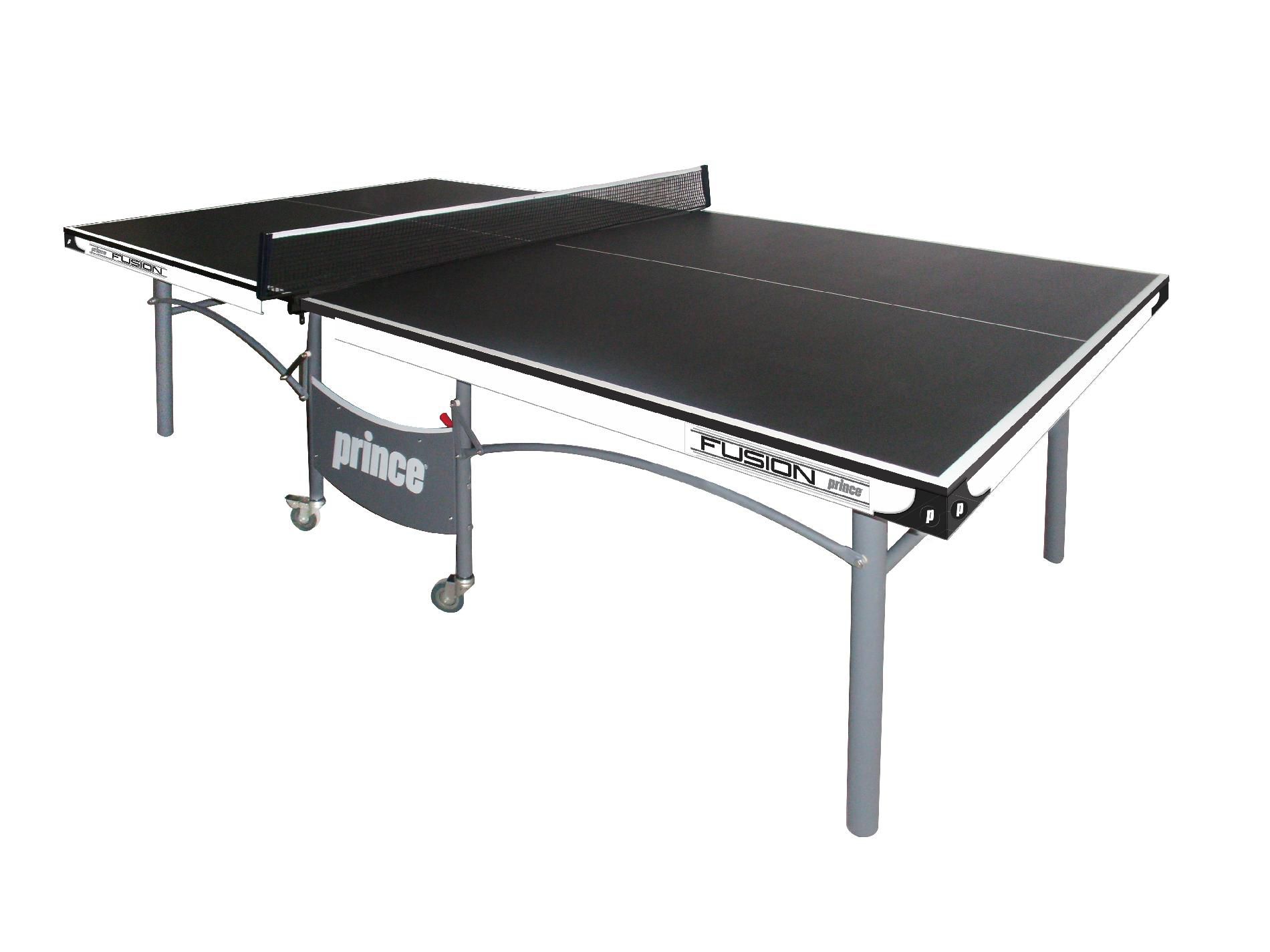 Prince Fusion Table Tennis Table Product Description Fusion table tennis table for fun competitive play Playability and design come together with the Prince Fusion Table Tennis Table . The full-size table measures 5- by 9-feet for competitive fast-paced table tennis matches. The dark playfield is divided with white 3/4 inch lines for serving and doubles play. A 2 inch metal apron runs the perimeter of the table and features the Prince Fusion logo to give it a stylish touch. And the table moves on casters for easy repositioning. Move it out of the way in between matches or roll it out for the whole family to enjoy. The Fusion table tennis table folds easily for playback and storage. |